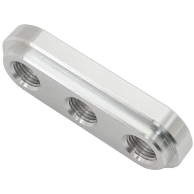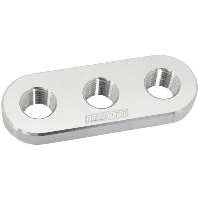 Aeroflow Performance Weld in alloy plate features 3 x 1/8" female ports. These handy plates are great for custom plumbing applications where the vehicle requires multiple sources for vacuum or breather returns back into any alloy pipe work. Overall length is 55mm, overall width is 20mm and overall thickness is 9mm.