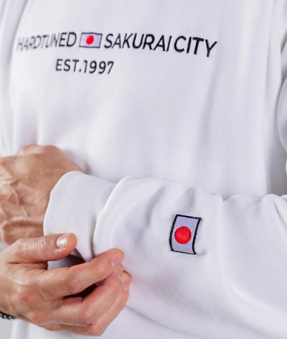 A super comfy, ultra-premium fleece sweater featuring embroidered artwork in custom stitching on the front. Extra detailing on the Sakurai sweater includes custom tags and a small Japanese flag patch on the lower sleeve.