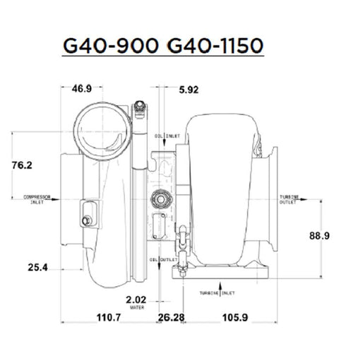 G Series G40 is available in 2 compressor inducer sizes. G40-900 (62mm) and G40-1150 (71mm) both G40 models are interchangeable meaning they are the same size and can be swapped out without having to reconfigure any other turbo kit parts.