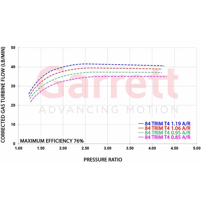 G40 turbine housing kits are available in four A/R. 0.85 A/R | 0.95 A/R | 1.06 A/R | 1.19 A/R stainless steel housings with T4 divided inlet flange. The largest 1.19 A/R T4 turbine housing flows 43 LBS/MIN of air which is a 16% increase over the GTX4088R turbine wheel.