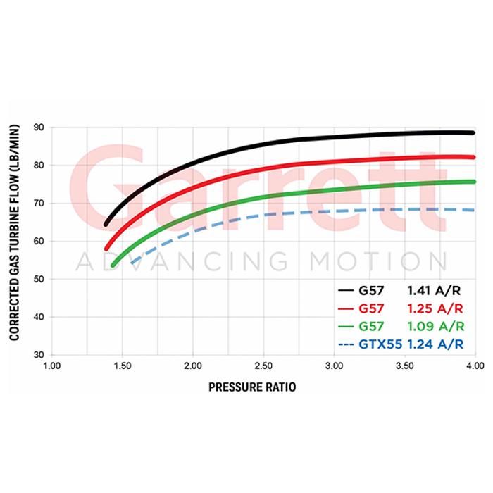 The newly engineered turbine wheel with optimized G Series aerodynamics increases flow up to 28% (Compared to GTX Gen II, see graph below). The large 90 trim turbine stage measures 118mm at the inducer and 112mm at the exducer. G57 is offered with three stainless steel V-band turbine housings in 1.09 A/R, 1.25 A/R, and 1.41 A/R.
